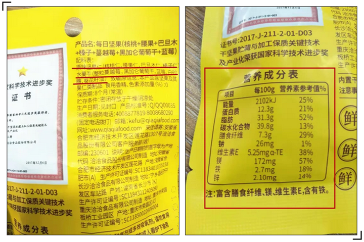 举个栗子:家长在挑选零食时,首先可以看一下食品背后的配料表与营养成分表: