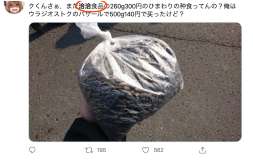 有趣的是,还有一位日本友人“炫耀”他在集市上用140日元的价格买到了500克的彩名堂瓜子——能在日本买到散装的彩名堂,这一定是位“铁粉”。